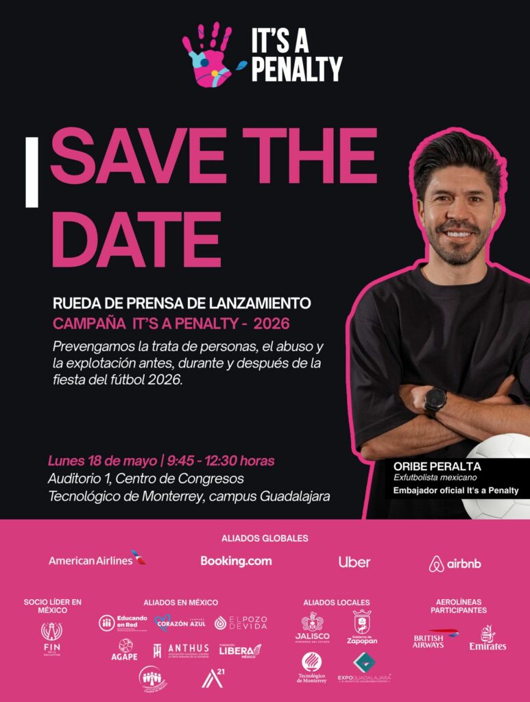 Fin de la Esclavitud, como socio líder en México de It’s a Penalty (https://itsapenalty.org/), te invita al lanzamiento de la campaña “It’s a Penalty – México 2026”, que busca aprovechar el poder del deporte para prevenir la trata de personas, así como el abuso y la explotación durante la Copa del Mundo.