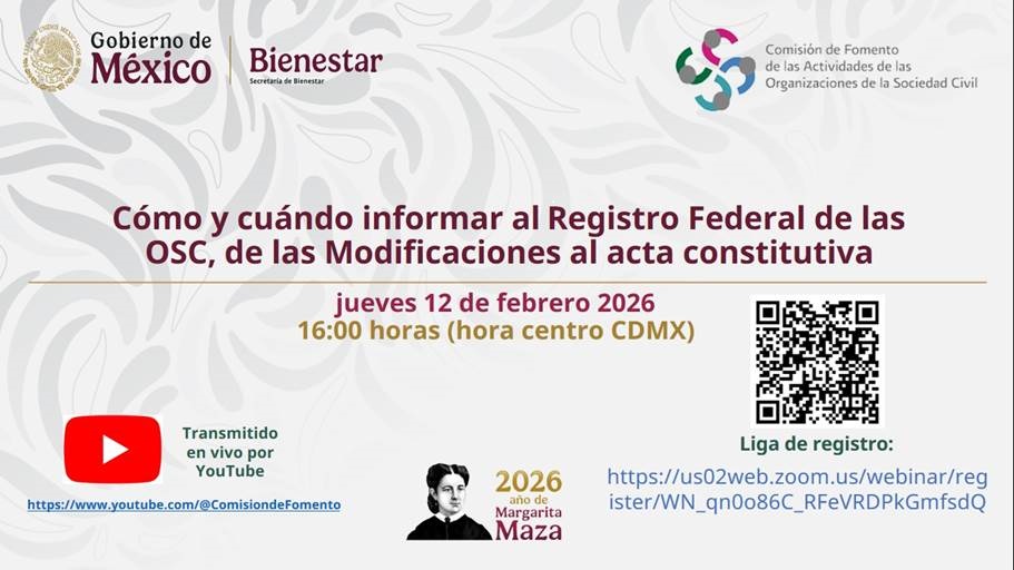 El Registro Federal de las OSC impartirá el jueves 12 de febrero de 2026, a las 16:00 hrs. (hora del centro del país), una capacitación con el tema “Cómo y cuándo informar al Registro Federal de las OSC, de las Modificaciones al acta constitutiva”, al cual se puede ingresar mediante la siguiente liga: