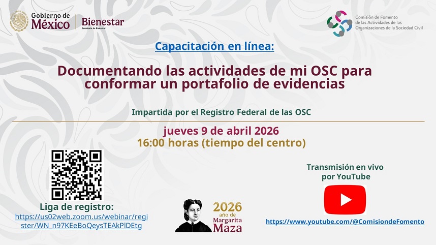La sesión será impartida por el Registro Federal de las OSC el jueves 9 de abril de 2026, a las 16:00 h (tiempo del centro de México).