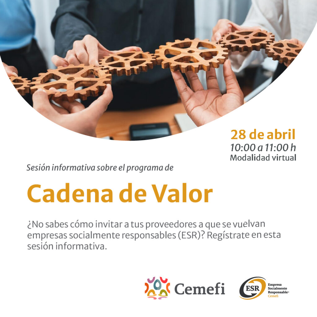 Participa en nuestra próxima sesión informativa virtual sobre el programa Cadena de Valor, donde te explicaremos el procedimiento para la postulación; así como, el proceso para invitar a tus proveedores a ser empresas socialmente responsables (ESR) y obtener el Distintivo ESR®.