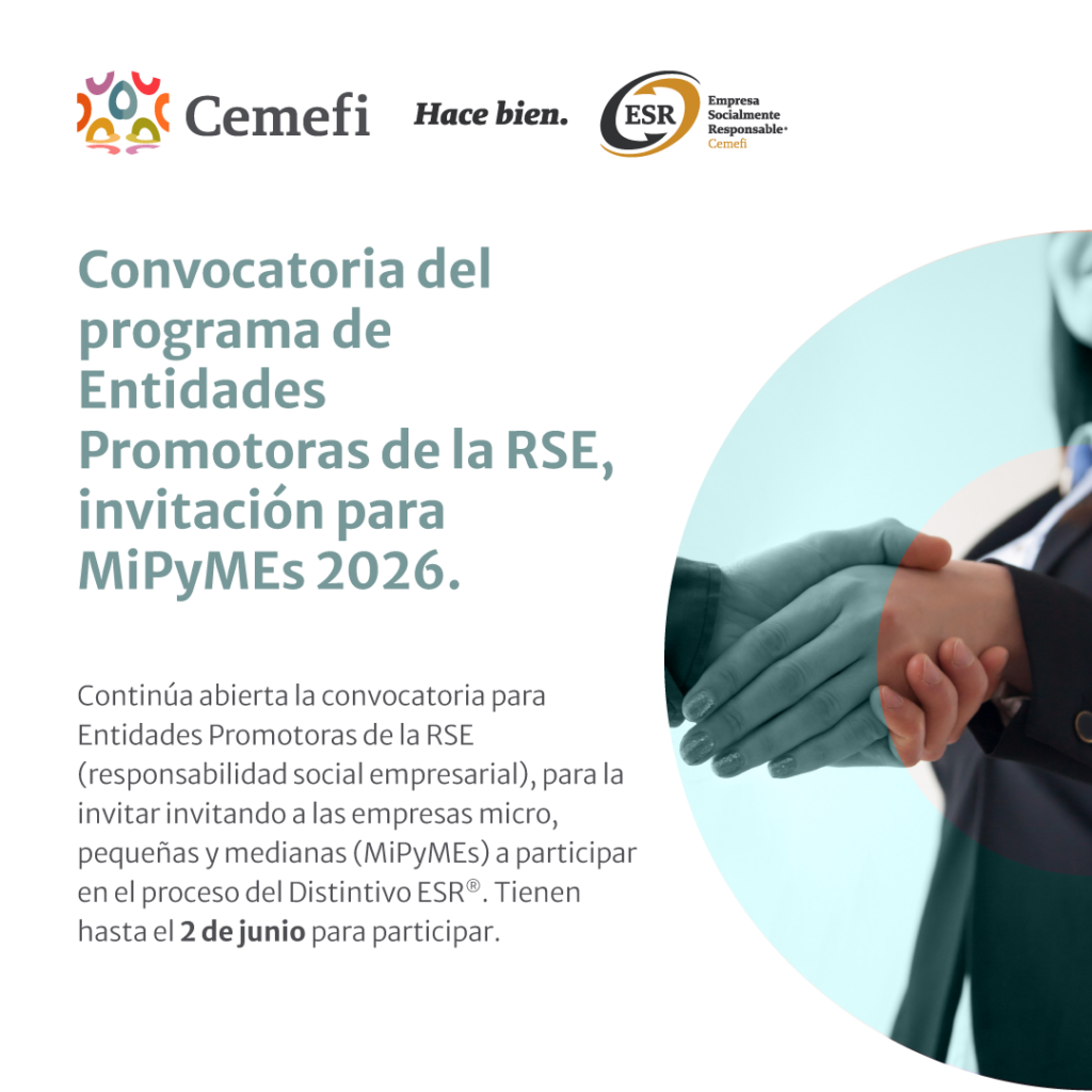 El Centro Mexicano para la Filantropía (Cemefi) informa que continúa abierta la convocatoria 2026 del programa de Entidades Promotoras de la Responsabilidad Social Empresarial (RSE), en su segundo periodo, dirigida a organizaciones interesadas en invitar a empresas micro, pequeñas y medianas (MiPyMEs) a participar en el proceso de obtención del Distintivo ESR®.