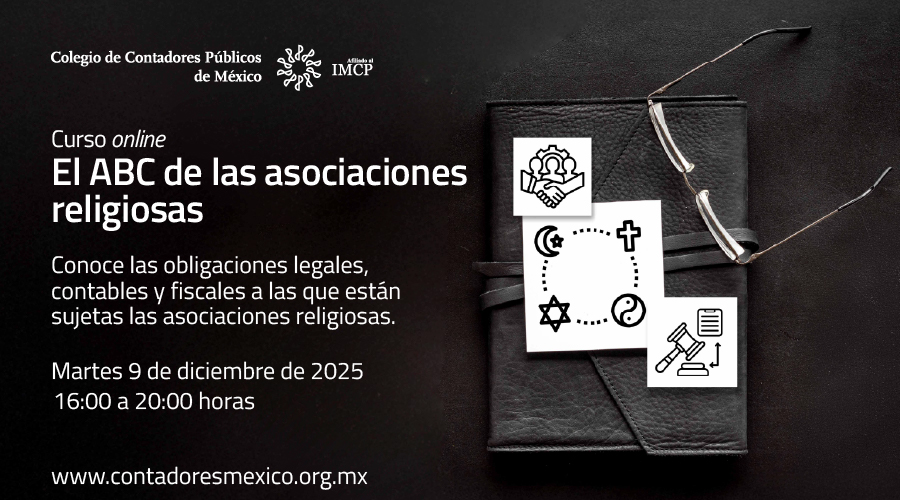 Con el objetivo de fortalecer el cumplimiento normativo y la gestión responsable de las organizaciones religiosas, el Colegio de Contadores Públicos de México te invita al curso virtual “El ABC de las asociaciones religiosas”, un espacio de formación que ofrecerá un panorama integral sobre las obligaciones legales, contables y fiscales que deben atender este tipo de entidades.