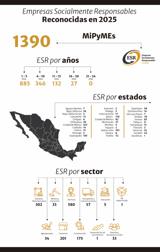 En la distribución geográfica, destaca la ciudad de México, con 323 empresas, Jalisco, con 178, y Guanajuato, con 105. En contraste, los estados en los que hay menos empresas con el Distintivo ESR son Durango (3), Baja California Sur (2) y Zacatecas (1). En la distribución por sector, destaca la industria de servicios, con 580 empresas; seguido de la manufacturera, que suma 302 empresas, y el de comercio, con 201.