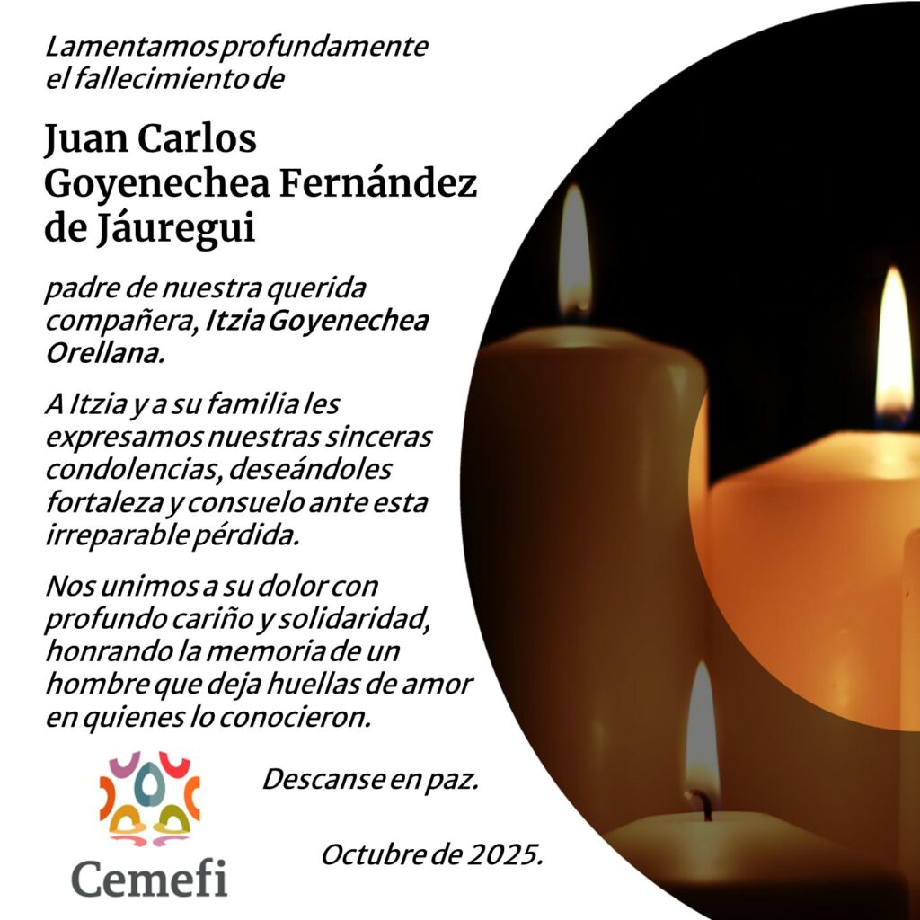 Lamentamos profundamente el fallecimiento de Juan Carlos Goyenechea Fernández de Jáuregui , padre de nuestra querida compañera, Itzia Goyenechea Orellana.