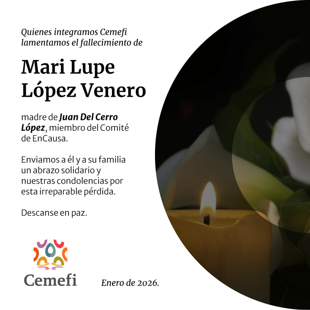 Quienes integramos el Centro Mexicano para la Filantropía (Cemefi) lamentamos profundamente el fallecimiento de la señora Mari Lupe López Venero, madre de Juan del Cerro López, integrante del Comité de EnCausa.