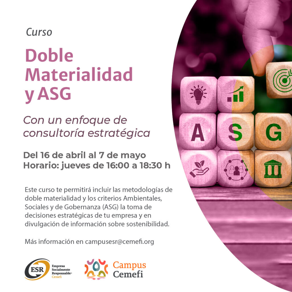Cemefi te invita al curso sobre doble materialidad como guía para la estrategia ambiental, social y de gobernanza (ASG), en el que conocerás como ha sido la evolución del análisis de materialidad y el valor que puede proporcionar en el momento de crear o actualizar la estrategia ASG de la organización.