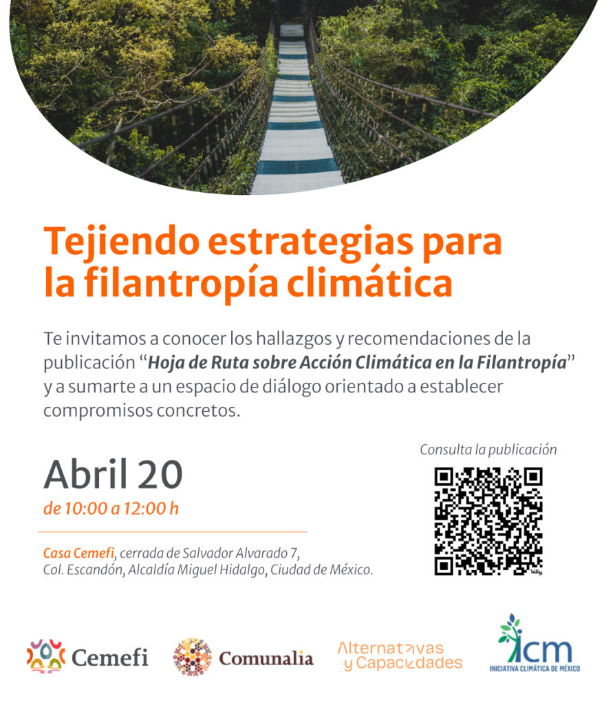 En el marco del Día de la Tierra, el Centro Mexicano para la Filantropía (Cemefi), en colaboración con Comunalia, Alternativas y Capacidades y la Iniciativa Climática de México, llevará a cabo la presentación de la Hoja de Ruta sobre Filantropía y Acción Climática, un documento construido de manera colectiva que reúne hallazgos y recomendaciones para fortalecer el papel del sector frente a la crisis climática.