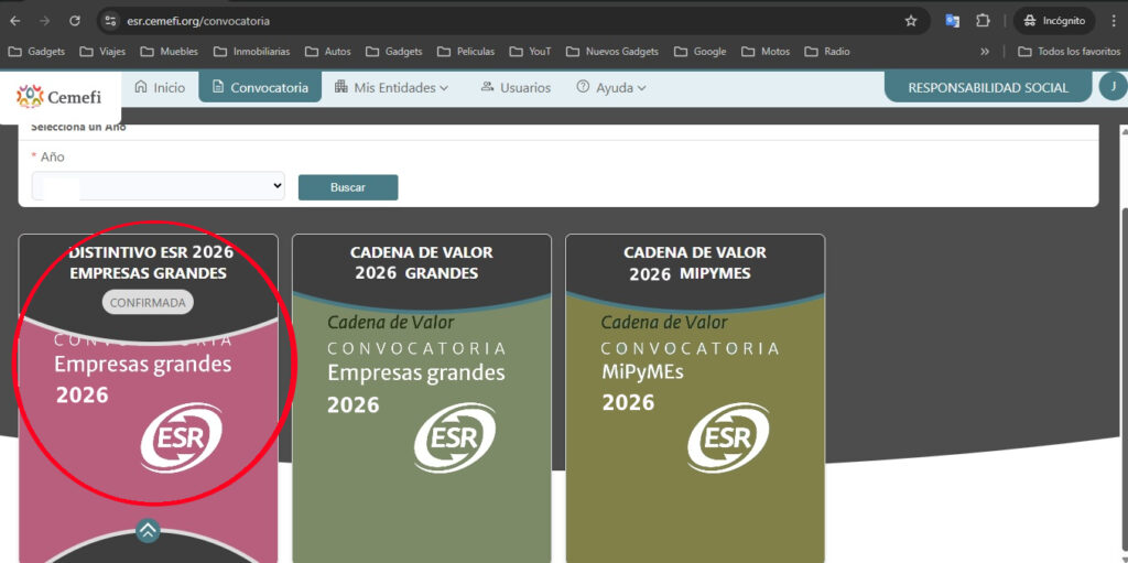 3⃣ Con el indicador del mouse deberás posicionarte en el cuadro denominado “DISTINTIVO ESR EMPRESAS GRANDES 2026” y seleccionar la opción “ir a publicaciones”.
