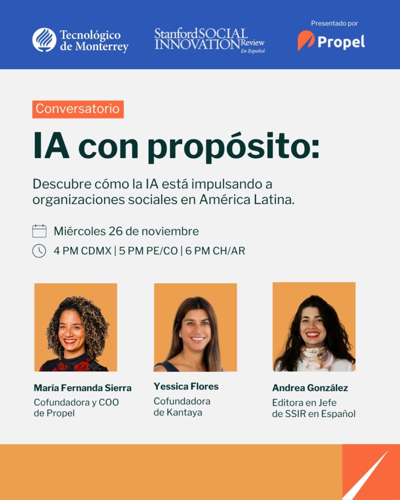 Descubre cómo la IA está impulsando a organizaciones sociales en América Latina, un conversatorio presentado por Propel y Stanford Social Innovation Review en Español.