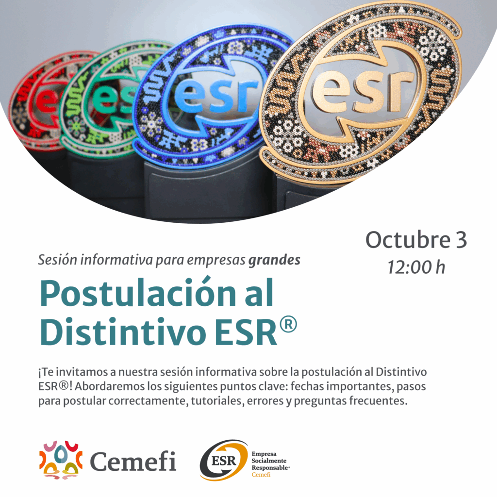 Si eres parte o tienes una empresa comprometida con la mejora social, económica y ambiental de México, de tamaño grande, y piensas postular a la convocatoria 2026 del Distintivo ESR® de Cemefi, te invitamos a unirte a las sesiones informativas en las que te orientaremos sobre el proceso de participación en cuatro pasos y resolveremos tus dudas para una correcta postulación.