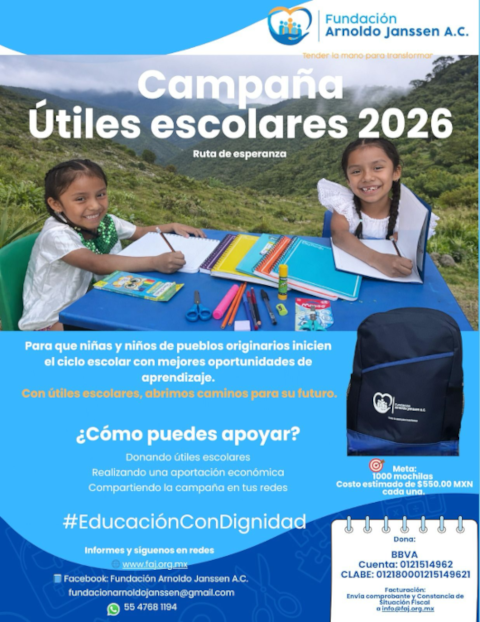 La Fundación Arnoldo Janssen A.C. impulsa la Campaña de Útiles Escolares 2026 “Escribiendo juntos una Ruta de Esperanza”, una iniciativa solidaria que, desde 2022, busca apoyar a niñas, niños y adolescentes en situación de vulnerabilidad mediante la entrega de mochilas con útiles escolares completos.