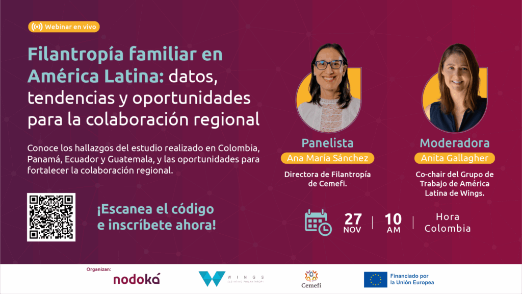 Durante el evento se presentarán los principales hallazgos del informe sobre filantropía familiar, elaborado por Makaia en Colombia, Panamá, Ecuador y Guatemala, en diálogo con WINGS LATAM, con el propósito de ampliar la perspectiva con datos y experiencias de otros países latinoamericanos.